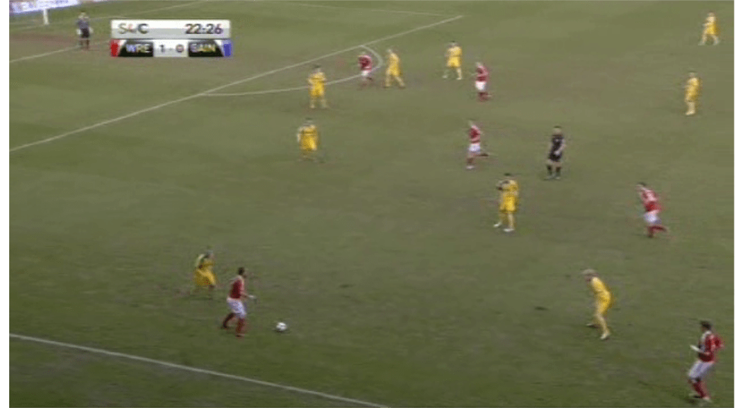 Perhaps Wrexham were fortunate: when Stamp pulled to the left he was able to exploit the lack of strength in the air of Walker and Westwood, but Hawkridge’s supply of quality crosses was coming from that side of the pitch: there was little coming from the right for him to attack when he pulled away to the left.